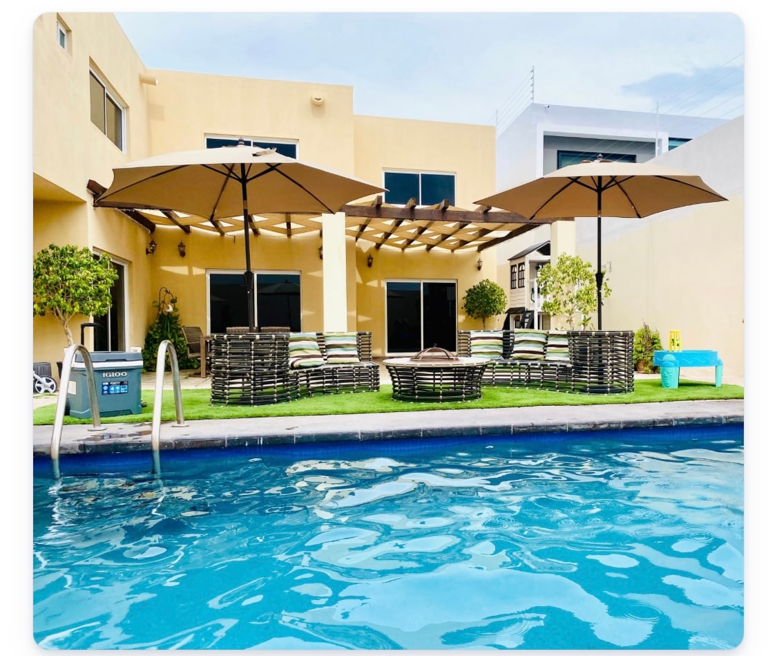Casa para 8 huéspedes al poniente, cerca del aeropuerto y estadio Fernando Valenzuela. Cuenta con 3 recámaras, 2.5 baños, sala, comedor y cocina equipada. Patio con asador de gas y mobiliario exterior. Incluye Smart TV, minisplits frío/calor, lavadora, ropa de cama, toallas de baño y alberca. Privada con acceso controlado y vigilancia 24/7. Estacionamiento para 2 autos. Ideal para familias o trabajo. Facturación disponible.