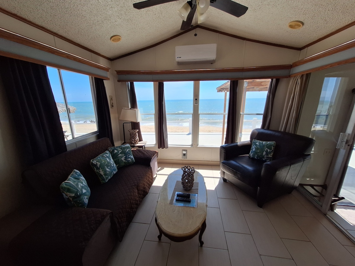 This private palapa casita embodies the desert-meets-tropics experience of San Carlos, Mexico. The spacious open floor plan inside includes one queen bed, a full bathroom, a stocked kitchen, and a large countertop/bar for food preparation, eating and entertaining. The large balcony/patio outside includes a charcoal grill, and wicker furniture. The following utilities are Included: AC, electricity, gas, Wi-Fi, purified drinking water via garrafon (a large jug), space heater and basic consumables.