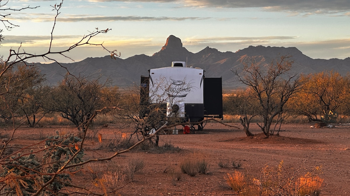 2020 32-foot camping trailer, with living space slide, conveniently located near central Nogales. Huge shade trees invite outdoor relaxation. Short hike to spectacular panoramic sunset viewpoint on top of the hill behind the church.