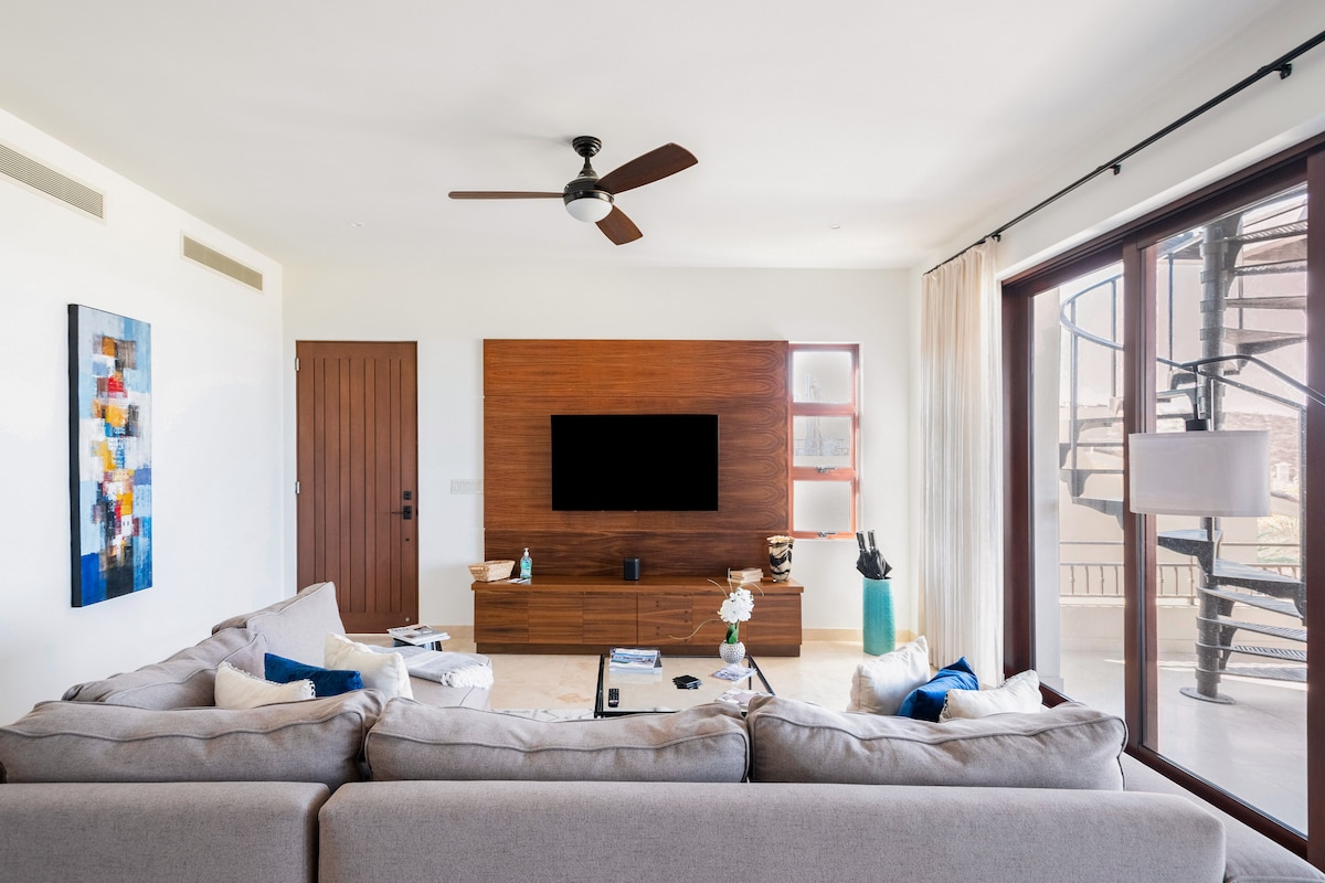 A UNIQUE LUXURY SPACE FOR YOU AND YOUR FAMILY (Contact us to rent your weeks) The Celebrity 2 Bedroom Penthouse Suite in Los Cabos offers you king size beds on each bedroom, a central living area, dining room, kitchenette, and bathrooms with Jacuzzis, the terrace displays magnificent ocean views where you will enjoy a a sofa and a coffe table, plus a rattan hanging chair. Located on the top floor of a private resort that features restaurants, beach club, golf course, swimming pools and gardens.