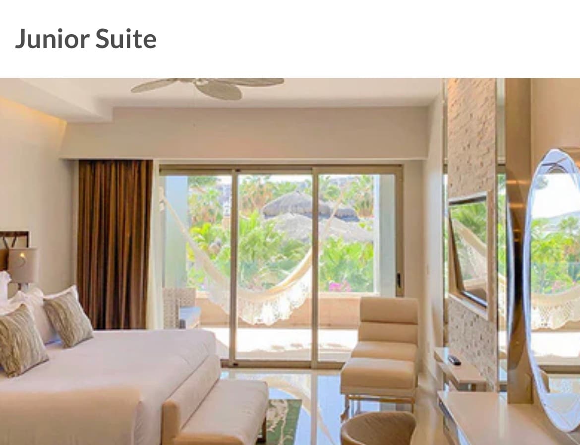 667 sq. ft. Luxurious and Spacious Suite at 5-Star resort: - 1 king (for 2 guests) or 2 queen beds with fine lines - private balcony with love seat, coffee table and hammock - spa-inspired bathroom with rain shower - 49-inch flat screen TV, fully-stocked wet bar Access To Resort Facilities: - pool access including adult only rooftop - beach with unbrella and beach chairs - gym - gourmet dining at world class restaurants (optional all inclusive or pay as you go) - luxurious spa (with fees)