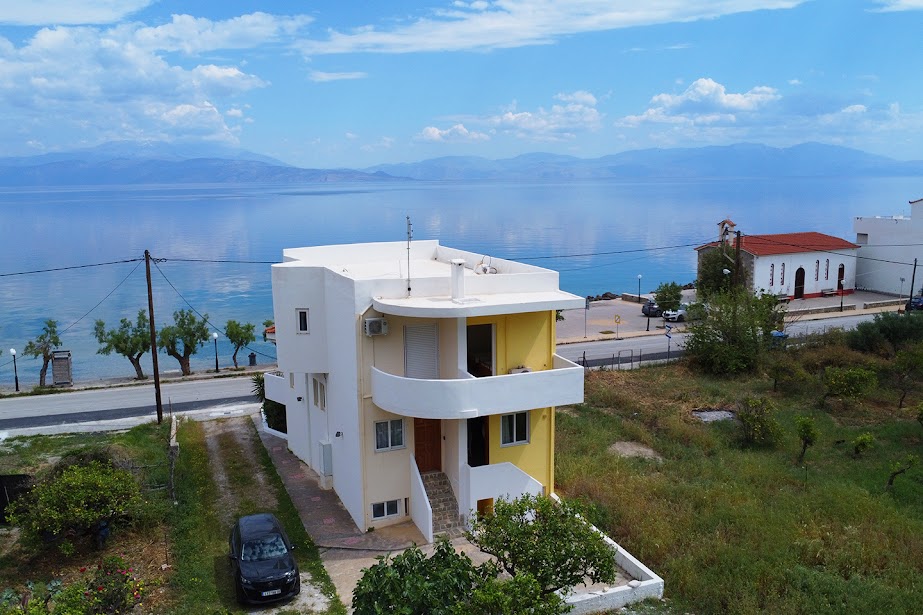 A beautiful spacious beachfront house situated just on the beach of the Corinthian Gulf in the Peloponnese, ideal for both families and couples wishing for a villa by the sea close to the most important archaeological attractions of the Peloponnese and near to the capital of Athens as well !Wireless Wi-fi all year long , brand new air-conditioning in every bedroom and closed garage among the many facilities this beachfront house is offering to guests