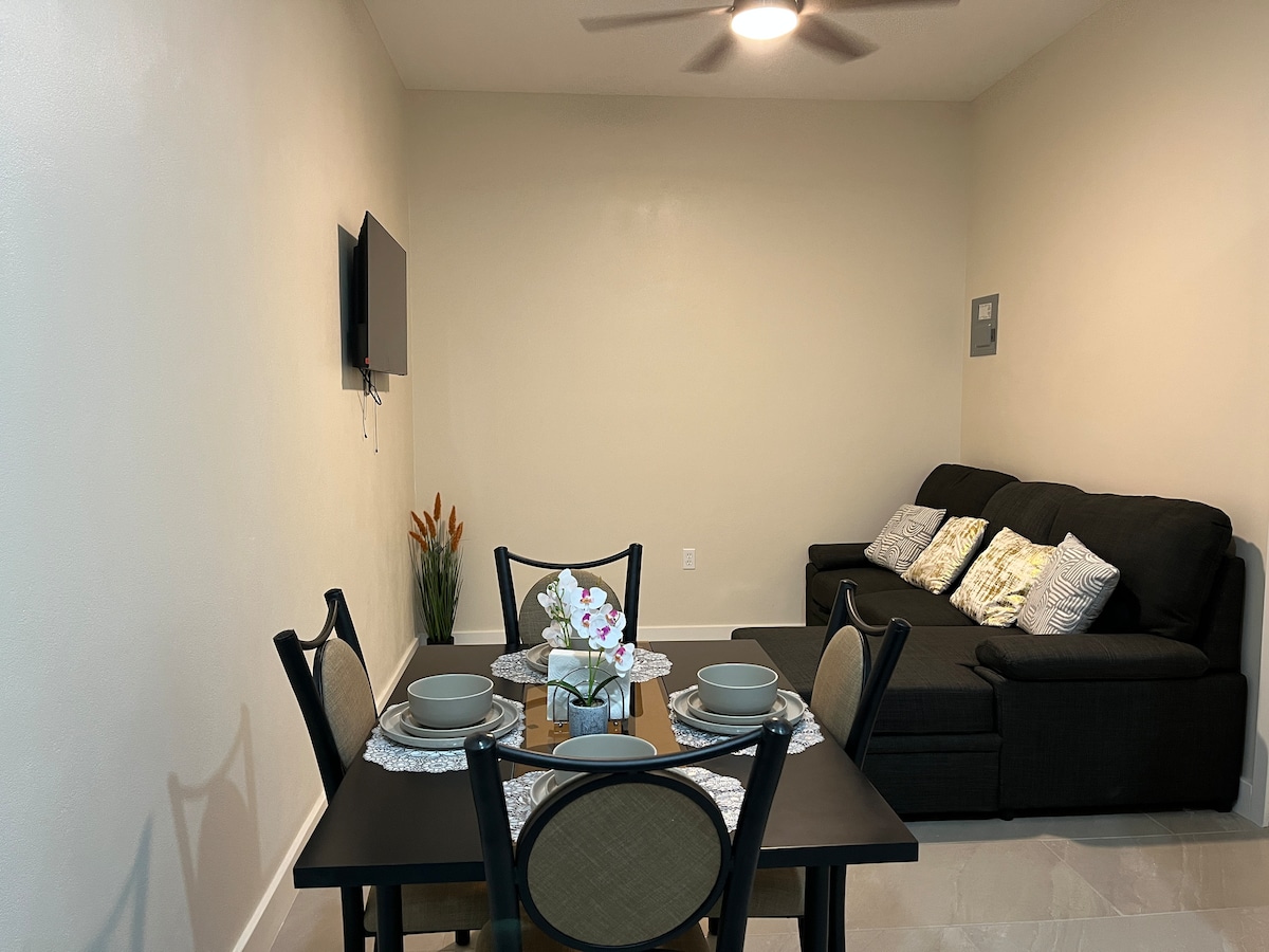 Apartamento climatizado, cómodo y céntrico. Ideal para familias, con capacidad para hasta 8 personas, incluyendo niños y bebés mayores de 6 meses. Ubicado en el segundo nivel, wifi, check-in flexible y parqueo. Cerca de restaurantes, supermercados, farmacias y principales centros comerciales de San Miguel. Distribución de dormitorios: * Dormitorio 1 (principal): cama king, baño con ducha independiente y sofá cama * Dormitorio 2: cama queen, baño compartido * Sala: sofá cama tamaño queen