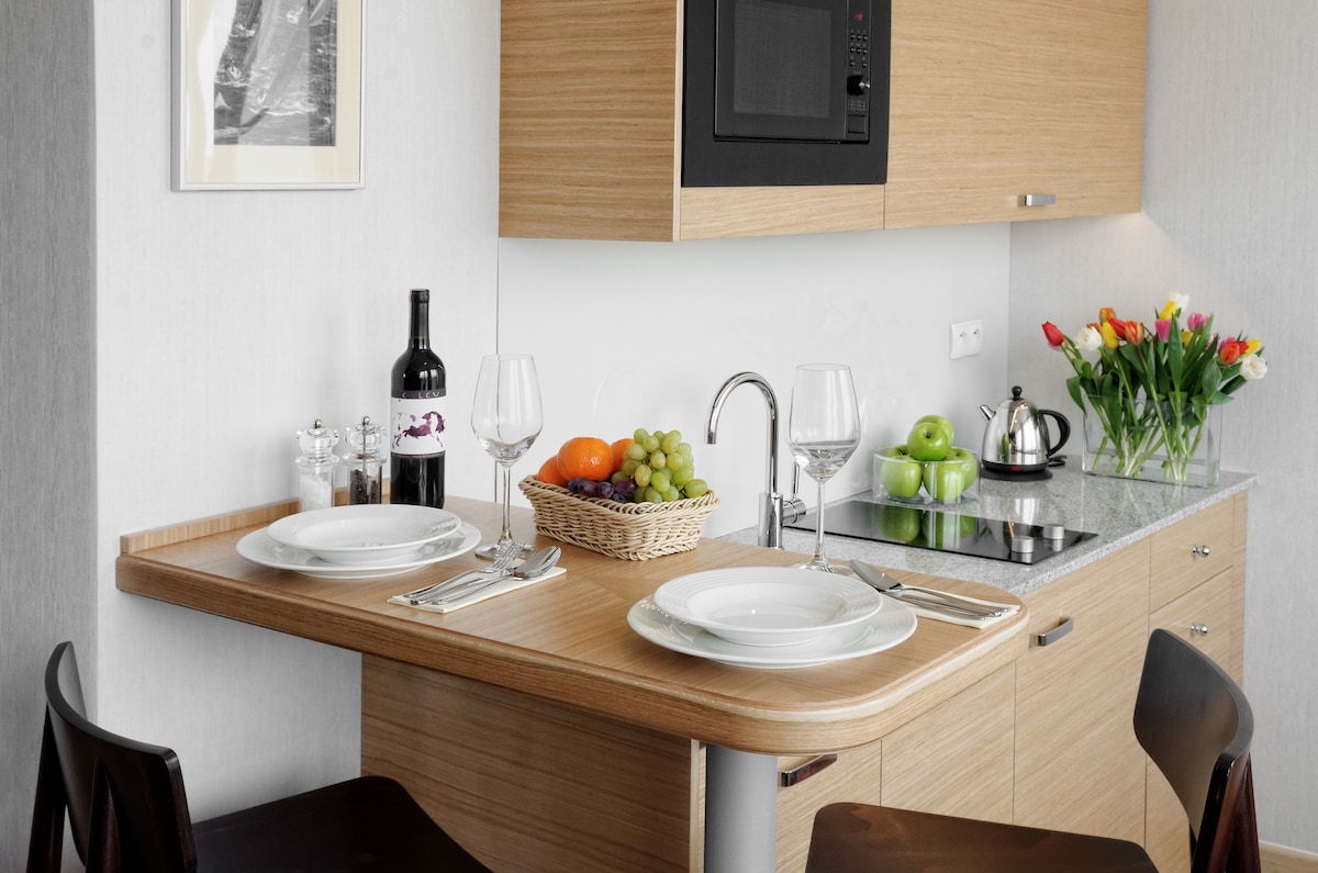 To w pełni umeblowane standardowe studio jest wyposażone w wygodne łóżko, stół i krzesła, szafki, oświetlenie oraz wszystkie niezbędne urządzenia kuchenne. Dodaj swoje osobiste akcenty, aby uczynić je naprawdę swoim. Sprytny układ łączy kuchnię, sypialnię i łazienkę w praktyczną przestrzeń z przytulną atmosferą.