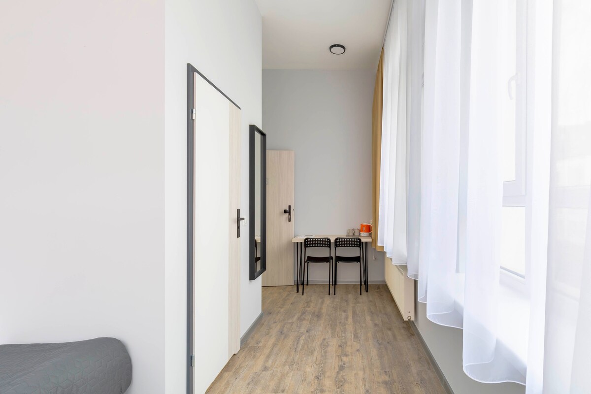Situated on the top floor, it offers comfortable conditions and unforgettable views of the Motława River and the Sołdek coal carrier. The interior is equipped with a double bed, a wardrobe with towels and accessories, a comfortable pouffe and a table with a chair for work and relaxation. Although it lacks a private bathroom, guests have access to two spacious bathrooms with shower cabins and all amenities.