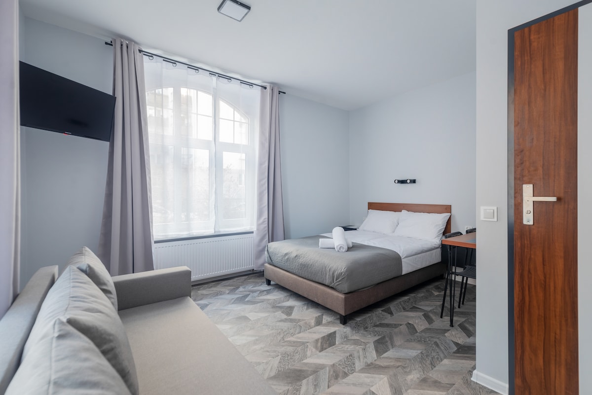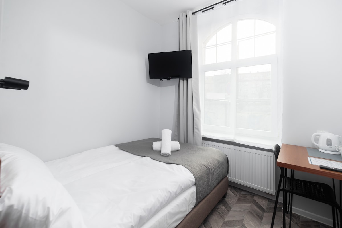 Standard double room with one 160 cm wide bed. Amenities in the facility: - Air-conditioned rooms and breakfast zone - WiFi - Elevator - The rooms are equipped with electronic locks - Taking care of the guest during their stay - Iron and ironing board - Free access to coffee, tea and homemade cake in the afternoons Additional services: Breakfast - 55 PLN/day/person Parking - PLN 50/day (earlier reservation required)