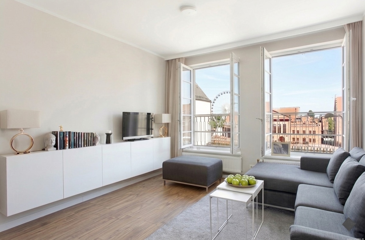 Nowoczesny apartament w centrum Gdańska z widokiem na rzekę Motławę, koło widokiwe, w sąsiedztwie Muzeum II Wojny Światowej. Główna sypialni typu ensuite. Druga sypialnia z dwoma kontynentalnymi pojedynczymi łózkami z możliwością połączenia. W salonie znajduje się rozkładana kanapa. Z okien apartamentu można podziwiać widok na Stare Miasto. Dodatkowe udogodnienia: garaż, pralnia, taras, restauracje. Miejsce parkingowe dostępne za dodatkowa opłatą.