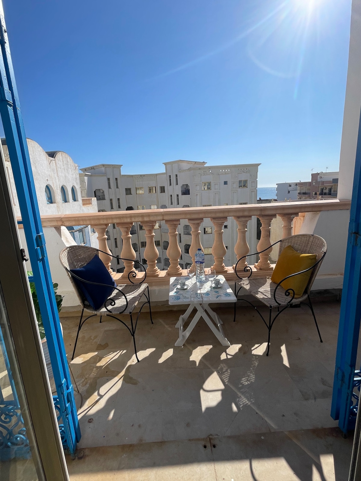 Discover a luxurious sea-view apartment in the city's heart. Wake up to Mediterranean panoramas from two bedrooms and enjoy coffee on a stunning terrace overlooking the coast. Located near The Medina and few minutes by taxi from Port El Kantaoui, this stylish space offers high-end furnishings, a well-equipped kitchen, WiFi, Smart TV, and modern comforts Two king-size bedrooms, an Italian-style bathroom, and workspace ensure a perfect urban retreat with easy access to cafés, restaurants, and bars