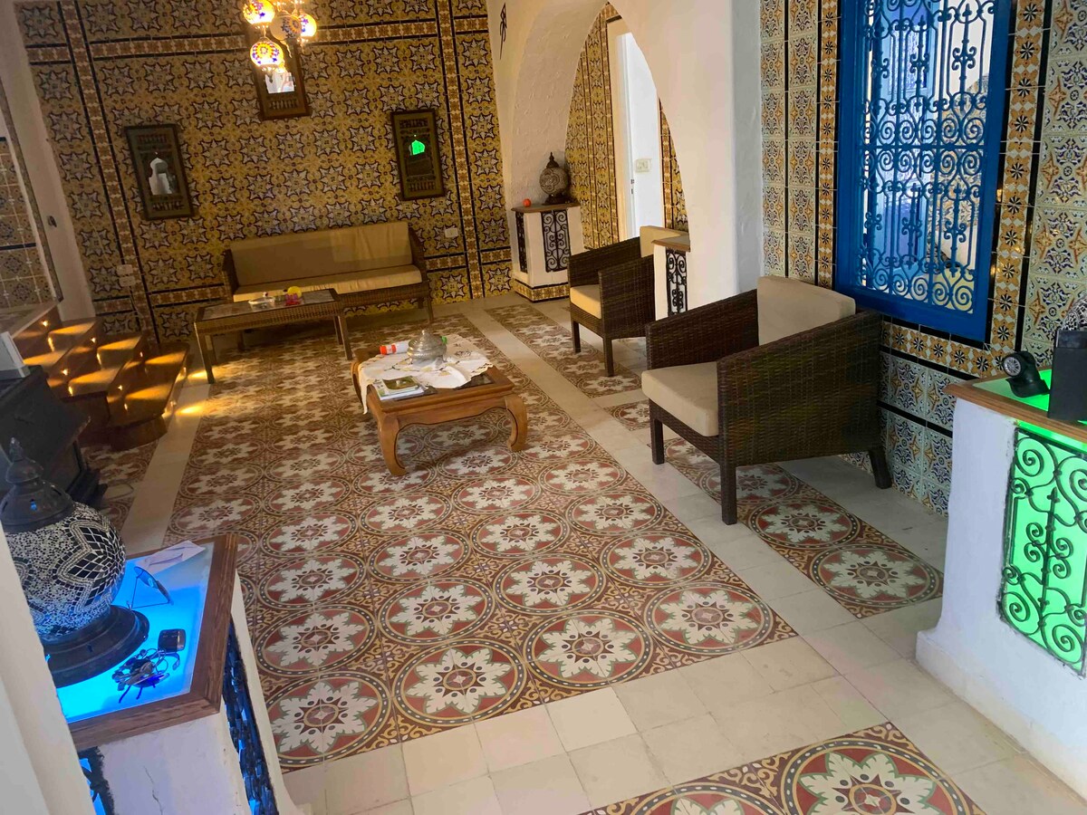 -Enjoy a stylish experience at this centrally-located place. - Quiet neighborhood -Wi-Fi available - sky view rooftop with breezy evening gathering including accessible bathroom and shower. - indulgence yourself with an old fashioned tunisian architecture backyard. *15 mn away from Monastir city center *35 mn away from Sousse city center *40 min away from Mahdia and city center. *10 min away from ksarhellal city center.