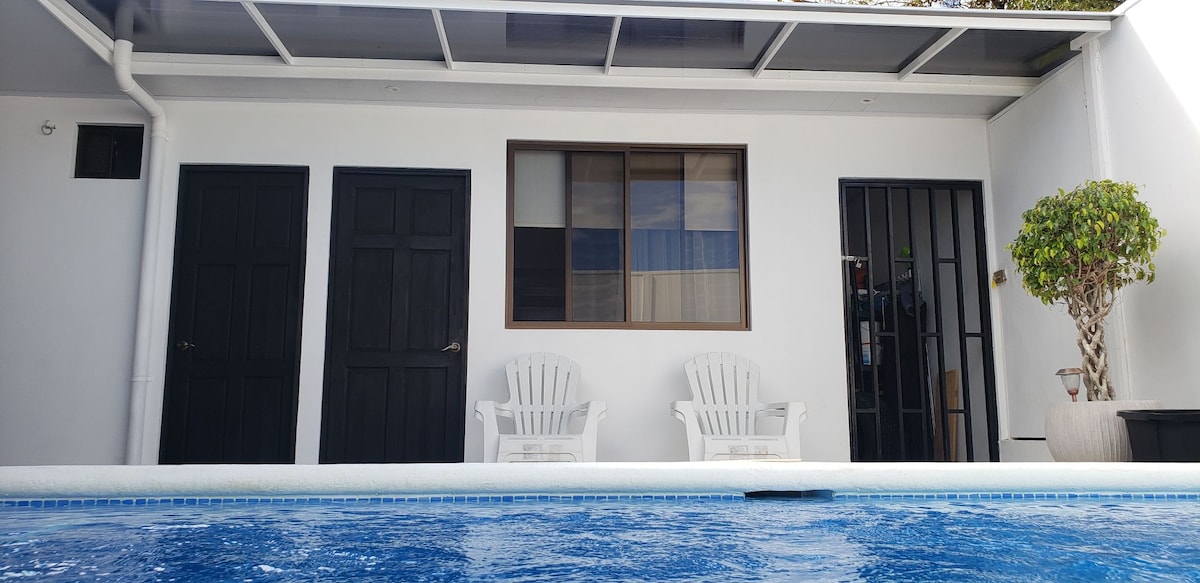 Modern suite surrounded by nature, just 2 min from famous surf beach Playa Hermosa (near Jacó). Comfortable space with 2 bedrooms (with A/C), 1 bathroom, and an outdoor covered kitchen/dining area. Relax on the terrace with garden views and spot white-faced monkeys, macaws, and toucans that visit daily. The guest suite is on the ground floor with private entrance but is part of our home where your host family lives. The fenced garden and parking are shared with us.