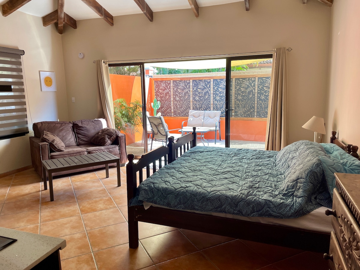 *NO AIR CONDITIONING Only a few blocks from Bejuco Beach (500m or 6 min walk - see map in photo gallery). Groceries, restaurants and transport are all within walking distance. - Queen size bed - Wi-fi - Separate entrance and patio - Kitchenette - Private bathroom - Shared pool, basketball and rancho area - NEW huge, second level guest area for yoga, lounging and a shared work space It is 1 of 4 cabinas located in the same building & there are a total of 6 rental units on the property.