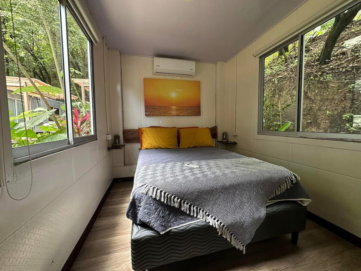 Reconnect with nature at this unforgettable escape. Nestled 5min from Playa Agujas, this 1BR container home offers a cozy sleeper sofa, private yard with BBQ, and access to a pool that is totally private. Equipped with AC and ample amenities, it's situated between two beaches, a 5min drive from Quebrada Gonado, and 20 min to Jaco.