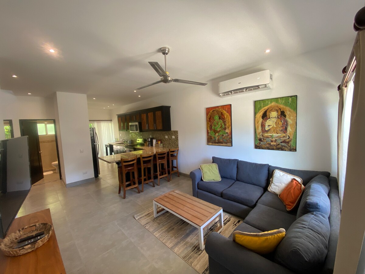 Live in style in the best location in Santa Teresa. This minimalistic - boho style 2BR townhouse is part of gated community miramar just across Playa Santa Teresa. You have 2 BR with each 1 queen bed + 2 full bathrooms, 2 terraces, kitchen, salon, jungle & ocean views from the master, AC, wifi, parking space, cleaning service and a shared pool. You will be surrounded by trees & tropical plants that attract beautiful birds, monkeys, iguanas & butterflies. Welcome to Paradise!