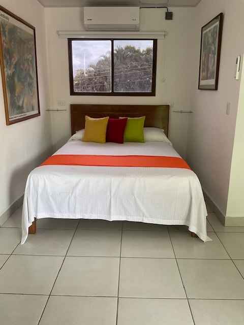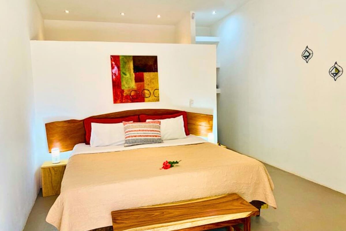 Habitaciones para máximo dos personas, una cama matrimonial, baño privado con ducha con agua caliente Aire acondicionado, TV, Mini refrigerador y amplio walk in closet Hotel cuenta con zona de comedor, área de co working, piscina, acceso a la playa cercana (5 minutos de caminata) desayuno típico incluido en la tarifa