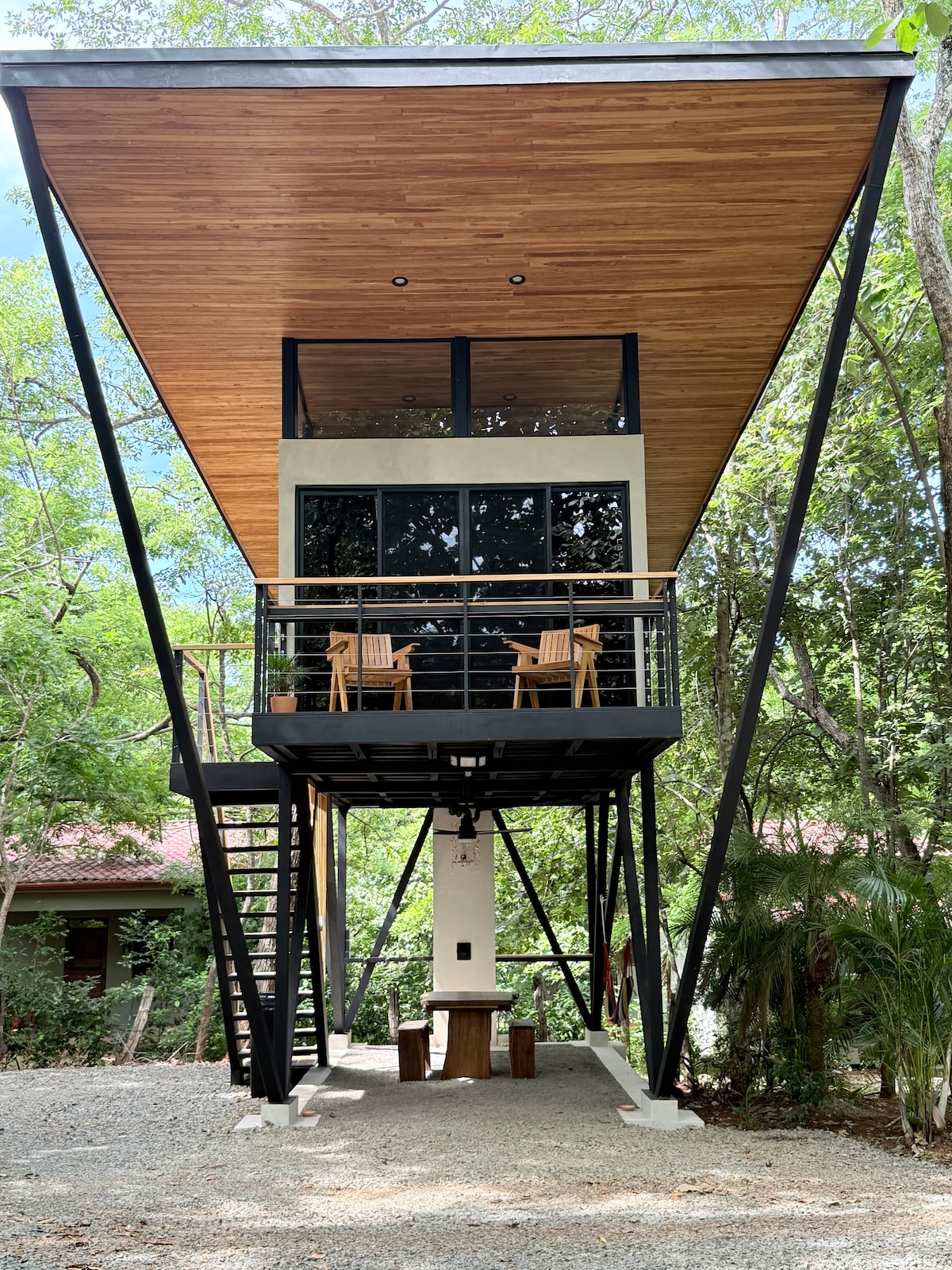 This brand new 2 bedroom guest home is perched at the top of the Escondido hill in the gated community of Rancho Villa Real. The living room and covered porch hang out in the tops of the trees overlooking stunning ocean and jungle views. Monkeys, birds and other wildlife are often seen inhabiting the surrounding tropical trees. The guesthouse has a very private entrance giving it a separate feel from the rest of the property. Guests will enjoy access to the Rancho Villa Real community pool.