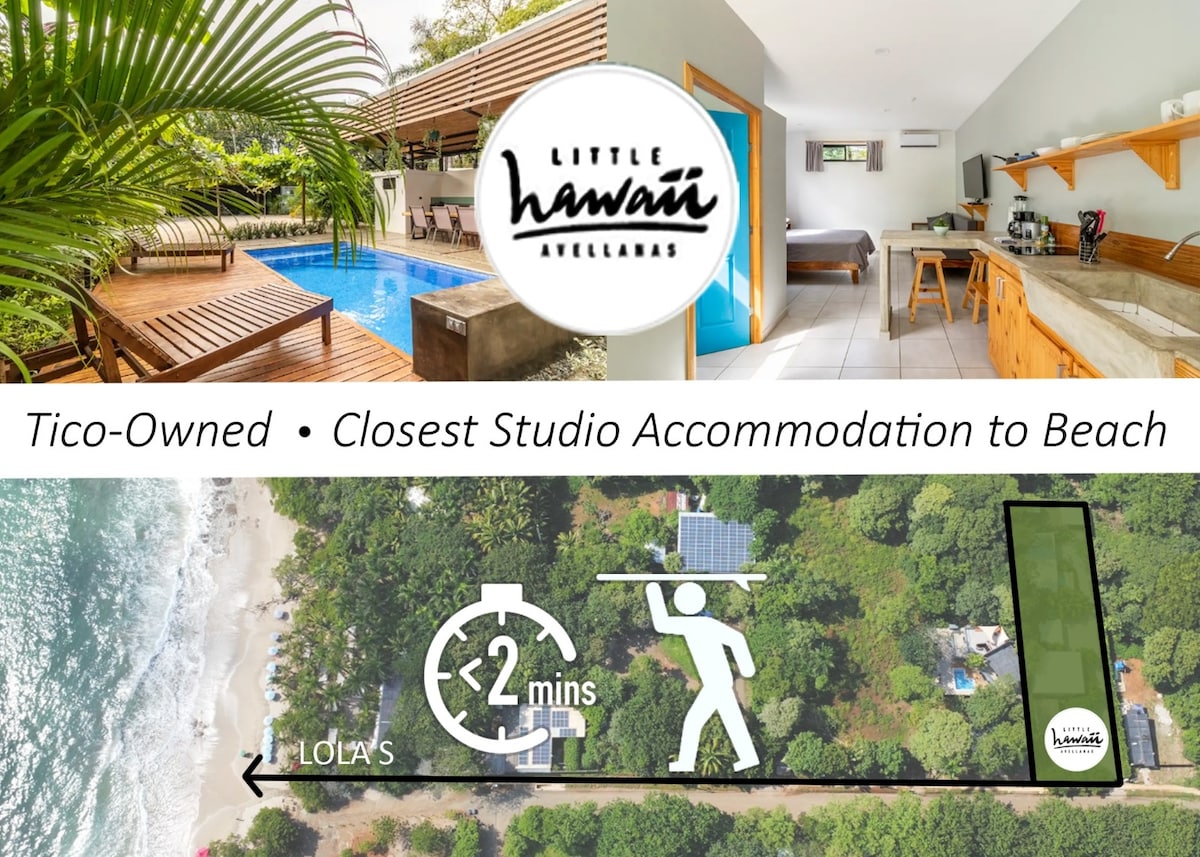 At Little Hawaii Avellanas we offer comfortable accommodation one block from the world famous beach break of Playa Avellanas. With only 4 studios on the premises, your stay will be private and relaxing. Each studio comes with a private kitchen, private bathroom, hot shower, private parking space, safe box, high speed internet, basic toiletries, 1 queen bed (1 sofa bed optl), ice cold AC, cable and 50" smart TV. The only amenities you will share with other studios are the pool and BBQ area.