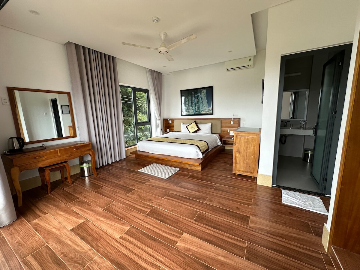 The place is located near the beautiful Ong Lang beach, far from the bustling city center, so the air is extremely fresh and clean. It has many green trees and a large swimming pool. All the rooms have air conditioner and a TV with Satellite Channels, and the staffs are very friendly and enthusiastic. The included breakfast buffet is delicious. In addition, the hotel also provides beach towels upon request at the reception. There are also free bicycles to borrow and motor cycles for rent.
