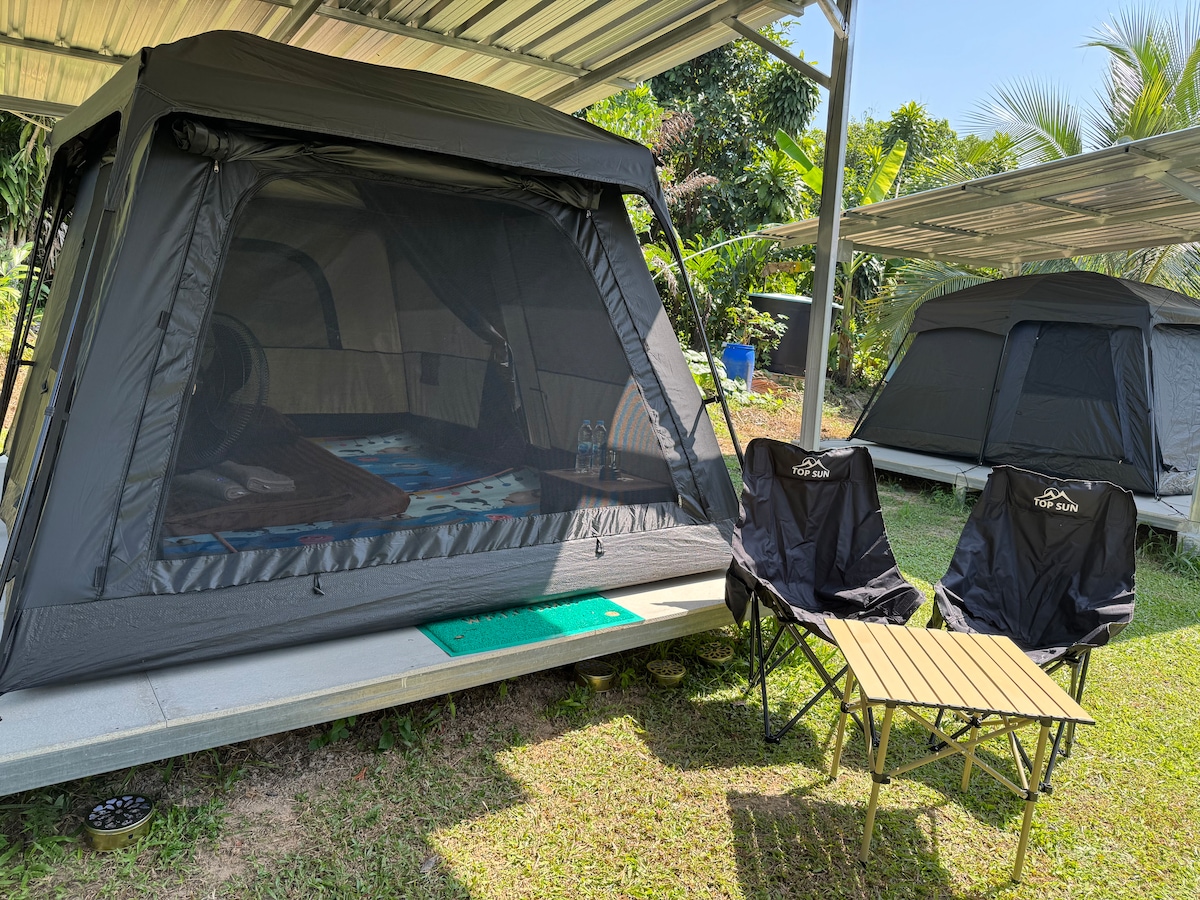 Three-Bedroom Glamping with View房型专为家人和朋友结伴出行而设计,空间宽敞,住起来舒适又放松。 房型包含: 1: 3 间独立卧室(2 间 1.8米的大床房 + 1 间两张1.2米的双人房),总共四个床位 2:室外设有独立用餐区 3:户外洗衣机 4:每间卧室设有独立空调 5:一间室内独立浴室+室外淋浴和厕所 6:公共泳池 无论是家庭出游、朋友聚会,还是多人度假,都能轻松入住。 而且酒店也设有公共泳池房型和私人泳池房型,酒店也有公共泳池区域,入住后酒店会提供可到达公共泳池区域的门禁卡。 Three-Bedroom Glamping with View房型非常适合希望住在一起、共享美好假期回忆的家人和朋友。并且可以在自然环境中,结合露营氛围与舒适住宿体验,享受安静、悠闲的度假时光 该房型共有 4 个独立帐篷房,房间设计与大小一致,确保每位客人都能享有同等的舒适感与体验。 请注意,酒店将在确认预订后根据空房情况安排具体入住房间。