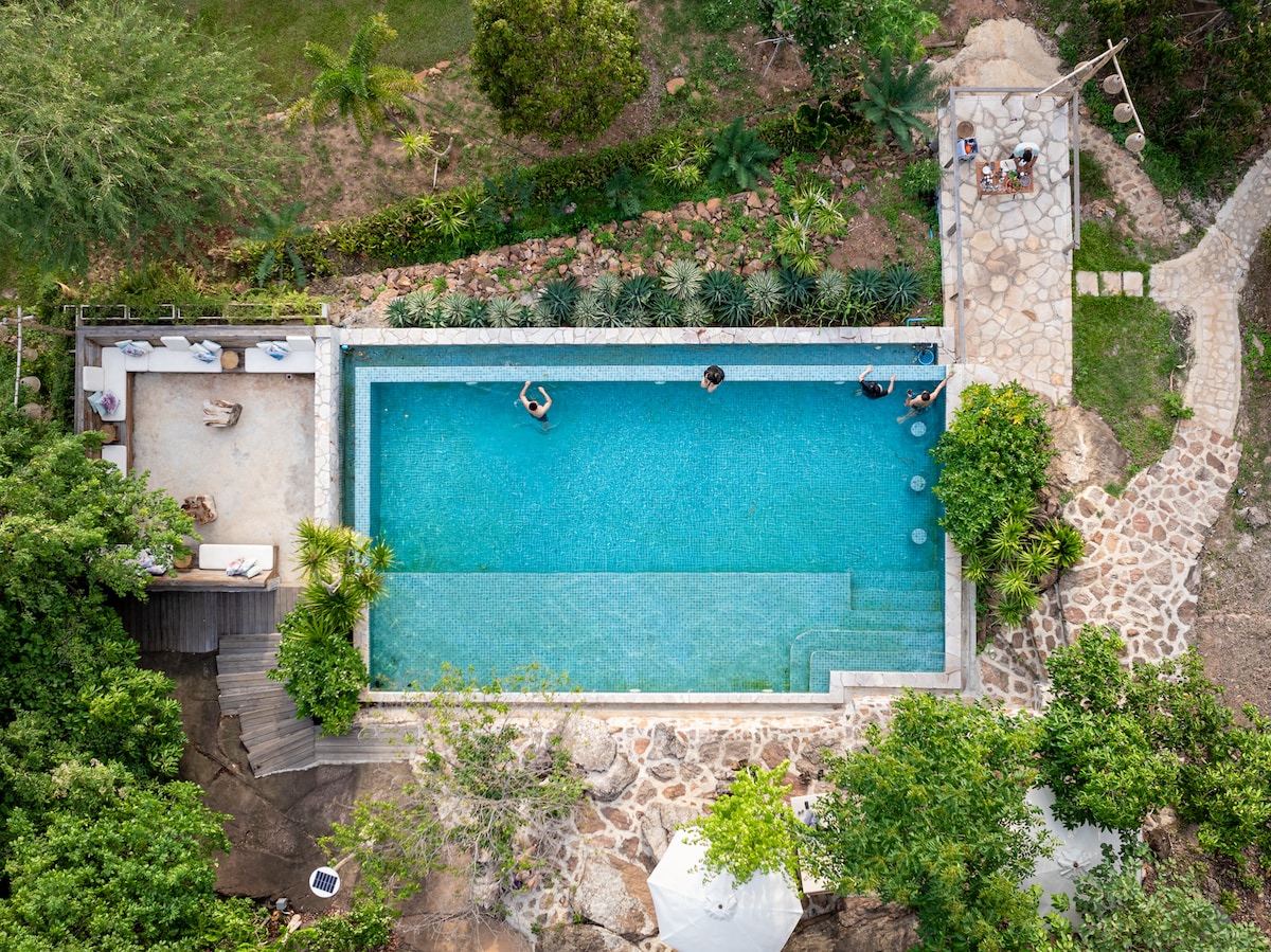 The sea view 1-bedroom house is located on a private, large and secluded area with its own private entrance This house is a place of peace and serenity, enjoy the large terrace overlooking the sea and koh samui either laying on sunbeds or you can relax in your own outdoor cargo net hammock. There’s also an outdoor shower where you are alone in the nature Follow a small path to enter the Cube House built integrating and respecting the nature and its huge rocks.