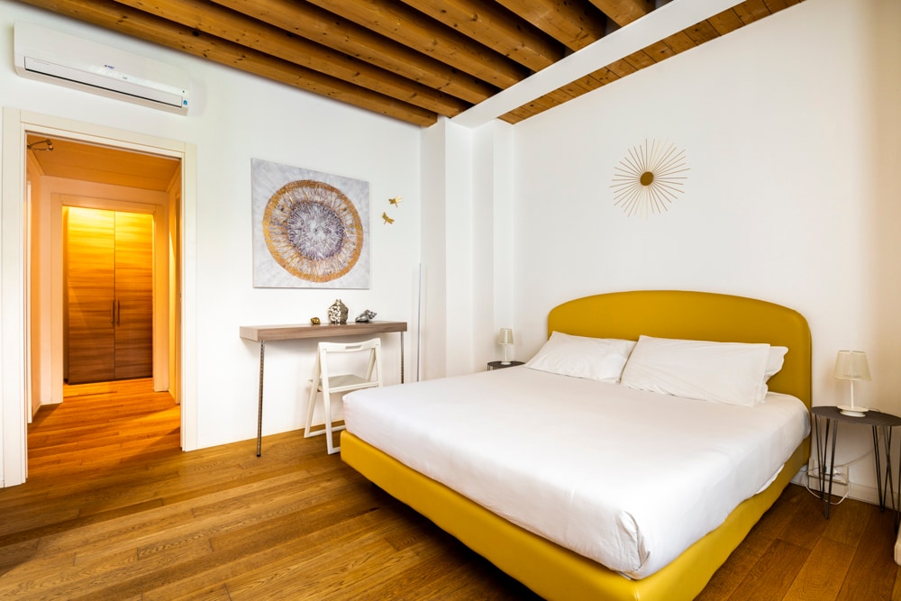 Admire the beauty of Venice from the arched windows of this welcoming and spacious apartment which combines historical elements, such as wooden beams, and contemporary furnishings. From the large windows you can enjoy a beautiful view of the canal, crossed by gondolas, and of the typical Gothic buildings of Dorsoduro, the most authentic district of Venice, appreciated by artists and intellectuals of all ages; equipped with two bathrooms and every comfort, you will find books and art objects.