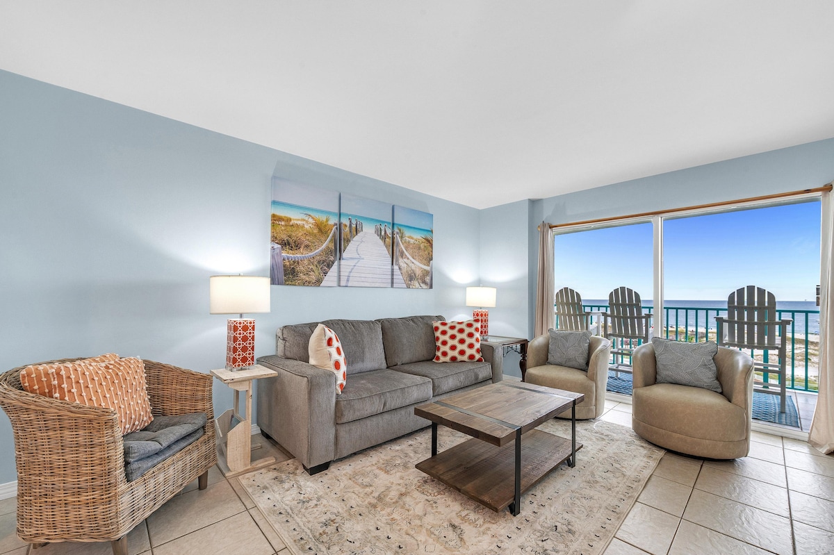 This one-bed/one-bath DIRECT beachfront condo is a top-floor unit at GSP The Resort (Bldg. 2) in Ft. Morgan that offers fantastic views of both Sunrises & Sunsets from your private balcony! You can feel the fun beach vibe when you step inside and know you're on your beach vacation! It's updated with "weathered-wood" tiled floors, a tiled walk-in shower, a vessel sink, and an L-shaped kitchen for extra counter space & storage. We aim to work with each guest so our GetAway remains 5-STAR worthy!