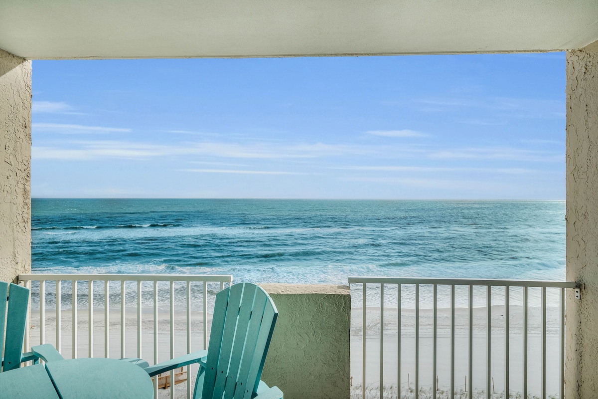 In the heart of Gulf Shores is this DIRECT beachfront condo with great views in every direction of the sugar white beaches & emerald waters. From the balcony you can watch the majestic sun rise & the sunset or marvel at the dolphins playing. Directly to the East is the public beach with many amenities for the whole family including restaurants, shopping & a playground. After a fun day prepare to make dinner in the well appointed kitchen, relax with the cheerful decor & comfortable sitting.