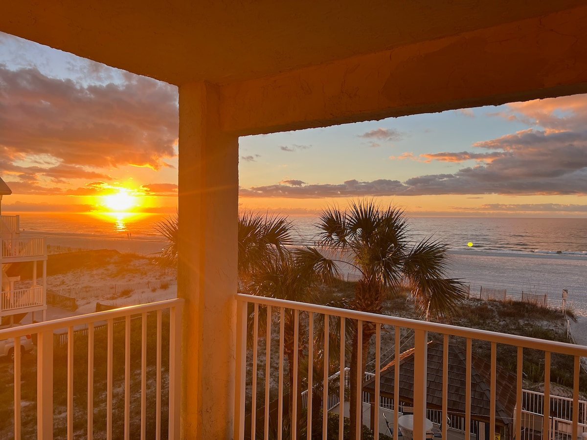 Our 2 BR 2 BA unit is on the first floor of a low density complex--59 units. The beach view is grand from our balcony-right in front of you as you walk out the balcony door! Living room has a large window showing a stunning view of the sugar sand beach & sparkling blue waves. From the balcony, enjoy drinking coffee & watching the activities on the beach, the red sunset or taking a nap listening to the methodical rolling of waves against the shore!