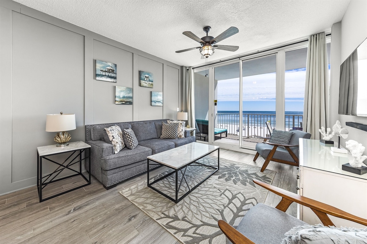 2 Bedroom + Bunk Room ~ Beachfront with views, sleeps 8! • Fabulous direct view of the Gulf's white sand beaches • Master King Suite with jacuzzi tub master bathroom, Second Queen Bedroom, Bunk Room • Balcony 8' x 24' across the entire unit complete with comfortable outdoor furniture - perfect for beach gazing • SMART flat screen TVs, new tile flooring, full size in-unit washer and dryer • Beach front, walkable to the restaurants, and nightlife • Park on the same floor as the unit • On site pai