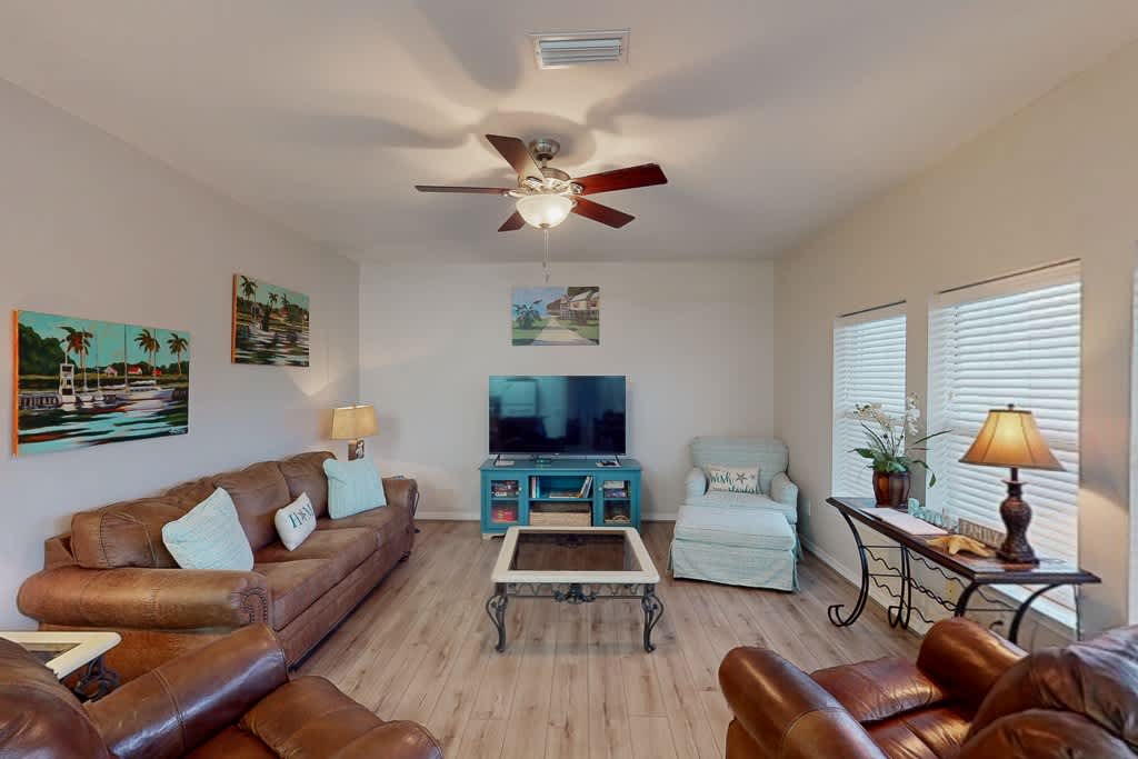 This home is located just across from the beach, central to Orange Beach, yet tucked into serene and peaceful surroundings. The home backs up to a pond of lilly pads and the Gulf State Park tree line! Ride the bikes to the community pool, or nearby restaurants and mini golf! Fish in the community lakes, and cook out with family and friends on the charcoal grill while playing corn hole. This home offers plenty of space for the whole family!