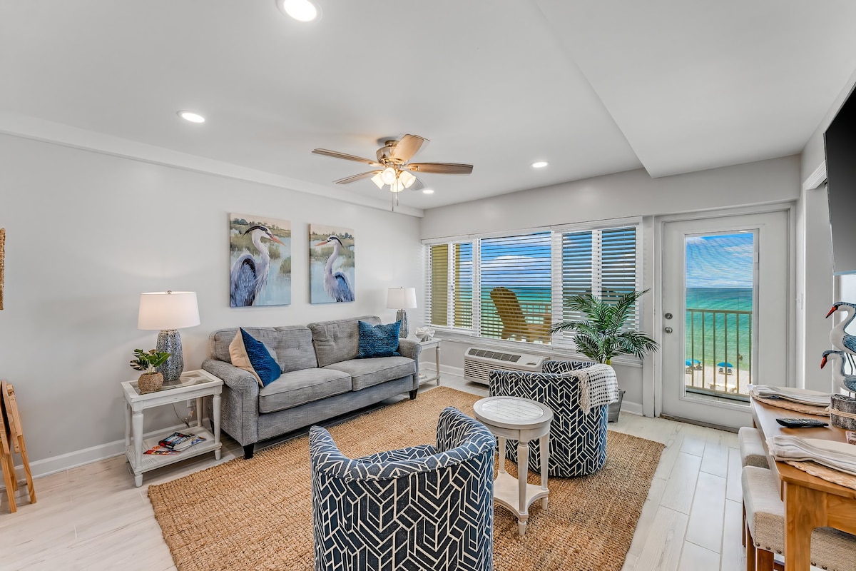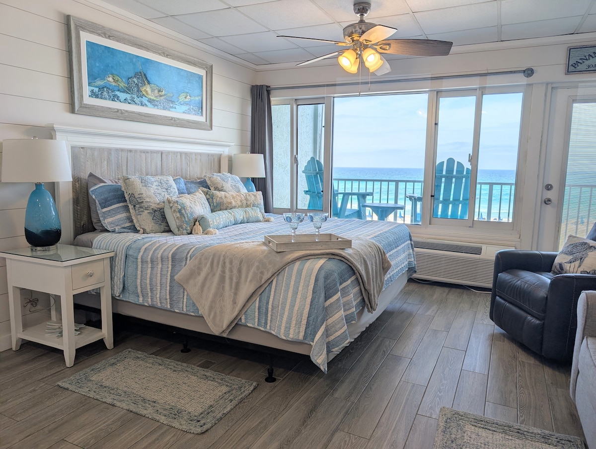 FREE BEACH CHAIRS/UMBRELLA (March 15 to October 31, 2026). The Complex was renovated in March 2026 and the studio was remodeled in 2023. We are located DIRECTLY on the beach in beautiful PCB, with your own private balcony!! The room has a King bed, loveseat, recliner and full kitchen and dishwasher. Bathroom has a beautiful walk-in shower. Within walking distance to Pier Park and many restaurants. New 2024 visa/coin laundry facilities on property. We have a Beachside café and heated pool!