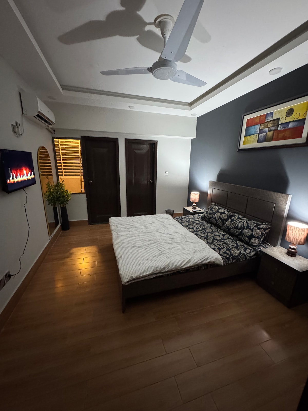 Experience a comfortable stay at our cozy 2 Bed apartment with outdoor sitting and peaceful environment you can see in these pictures • AC IN BOTH ROOMS • WIFI • TOWEL / SOAP / SHAMPOO • TV • kitchen accessories • FRIDGE • free parking 24/7 • servant to take care of your things or you want to order any thing from the outside GULSHAN FAMOUS FOOD STREET IS NEAR BY YOU CAN GET ALL THE RESTAURANT AND COFEE BAR NEARBY - pickup drop service fare is depends on your location