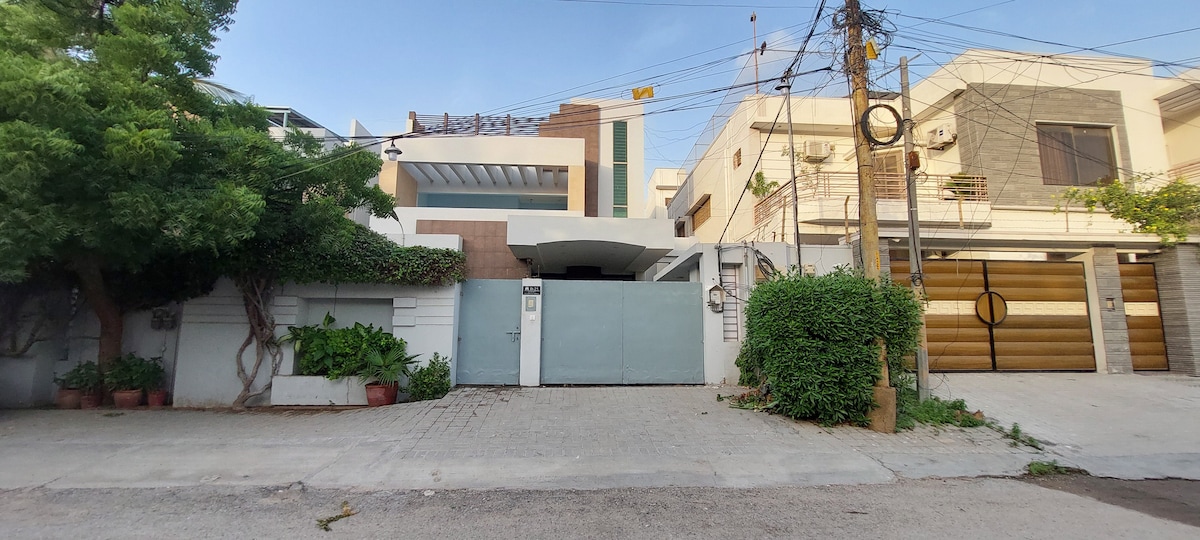 Enjoy everything Karachi has to offer while staying in this brand new 7 ⭐️, beautifully decorated,3 bedrooms,8beds, 4 bathroom home.The large space features a lounge, drawing room, patio, rooftop, dining room, 2 kitchens and laundry room. Conveniently located at Phase 6 Bukhari Defence Karachi, just 100 metres from the sea and 50 metres away from Khayabane Bukhari commercial.Dolmen mall 2 km away This house is perfect for all types of travelers who are looking to experience the city of lights