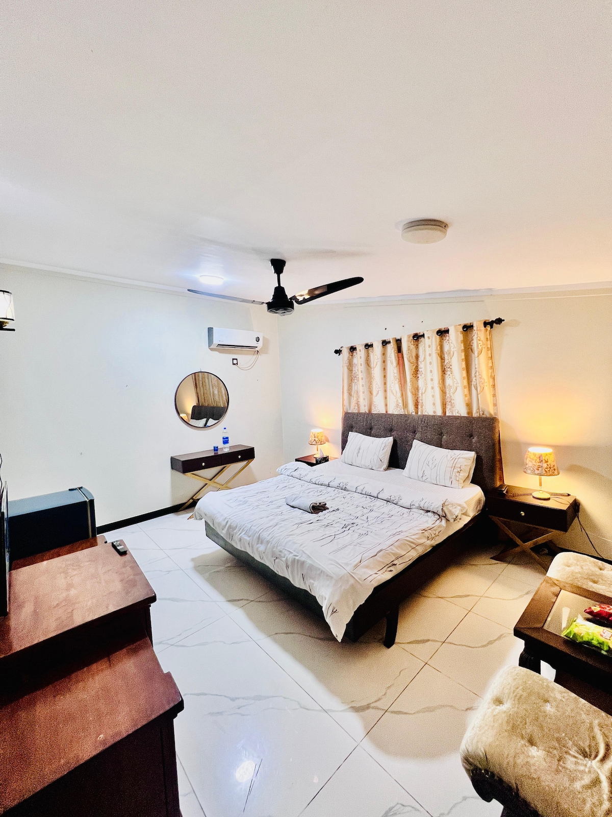 3 double bedrooms each with a ceiling fan and air conditioning with heating. There is a kitchen (with a cooker, microwave, a large fridge/freezer, kettle and toaster), 3 private bathrooms with shower and a lounge with dining table including a drawing room for guests. Inside private car parking space available with complementary WiFi... Please note: electricity will be charged extra at 33 Pakistani rupees per unit.