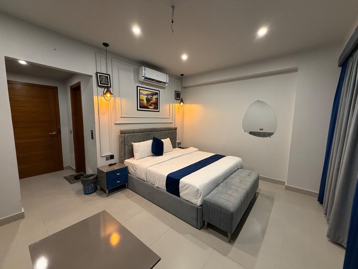 This comfortable double-bed room is ideal for 2-3 guests, offering all the essentials for a relaxing stay. Room Features: Double bed with space for 2-3 guests Convertible table and workspace Hotel Amenities: 24/7 access to the gym Room service Secure Parking Nearby food spots, marts, and hospitals Breakfast & extra mattresses (additional charge) House Rules: No smoking No unmarried couples No alcohol Enjoy your stay in the heart of the city with everything you need just steps away!