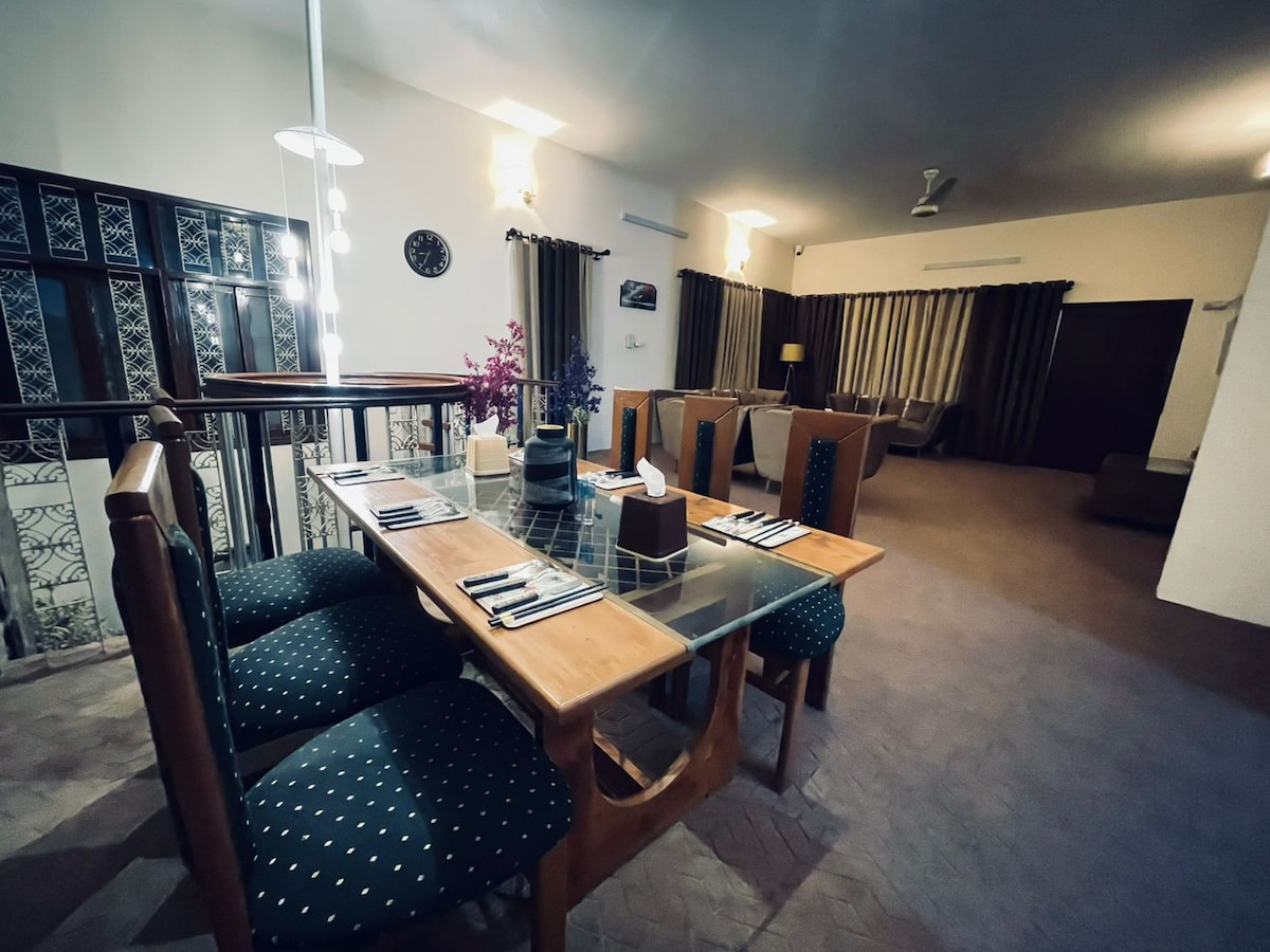 6-bedroom with all attached Bathrooms, luxury home with lounges and a drawing room. Ideally located at close distance to Lucky One Mall, KDA Market, salons, a variety of restaurants and a Masjid. Each room has an ensuite and AC. Enjoy our garden patio, terrace, WiFi, and TV. Free laundry, optional service for a fee. 24/7 security, private guards on request for an extra charge.