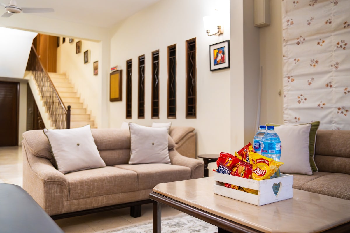 Spacious 2nd-Floor Home on 600 sq yds with Terrace in Iconic Location. This space offers everything you need for a comfortable stay, including: •Two spacious rooms with 2 double beds and 1 single bed •Three bathrooms •A fully equipped kitchen •A dining & cozy sitting area. • laundry facility •Private terrace •Located near National stadium & Time Medico •Free parking & guard services This centrally located gem is the perfect choice for your stay.