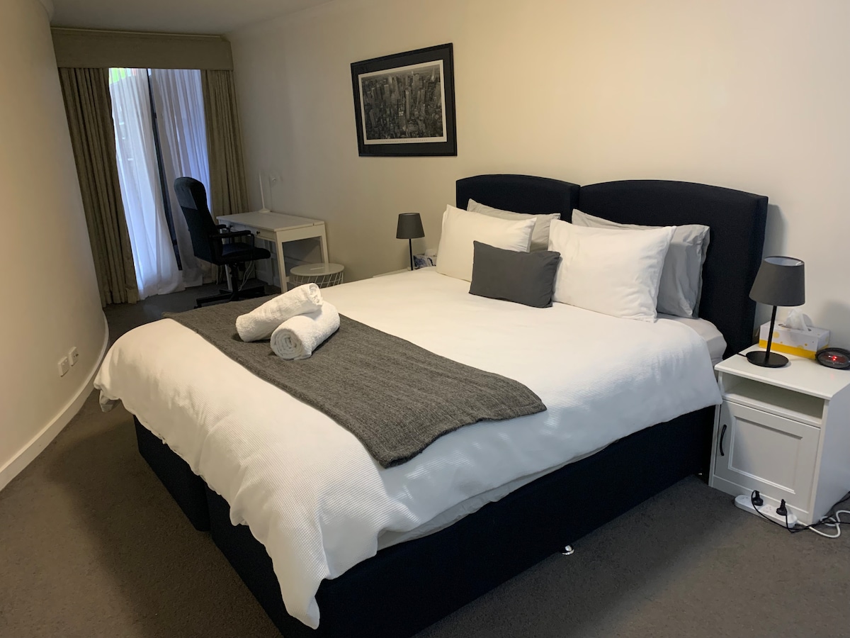 Our spacious Studio Apartment features a king-sized bed or twin singles and comes equipped with a fully equipped kitchen that includes hot plates an oven, microwave and fridge, full laundry services, a work desk, and a dining table. The apartment also includes a TV and high-speed internet access to satisfy all digital needs.