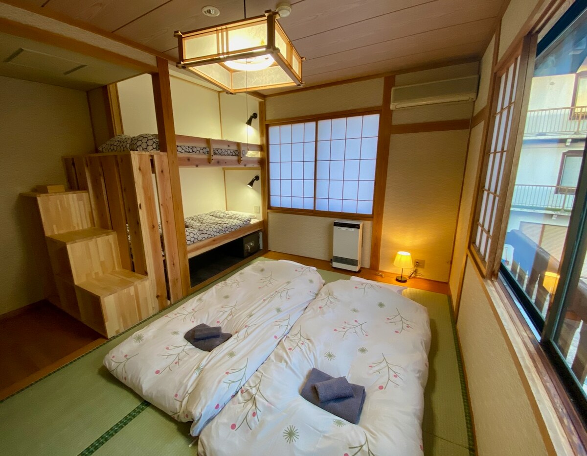 This twin room has delightful views of the valley and surrounding Japanese Alps. It has super comfy futons with its own private ensuite. This style of accomodations is great option for a couple or friends wanting that extra privacy. We are just 100M from the slopes and 50m from the closest of the 13 natural hot water onsens in town. (if you prefer western style bedding please ask at the time of booking)