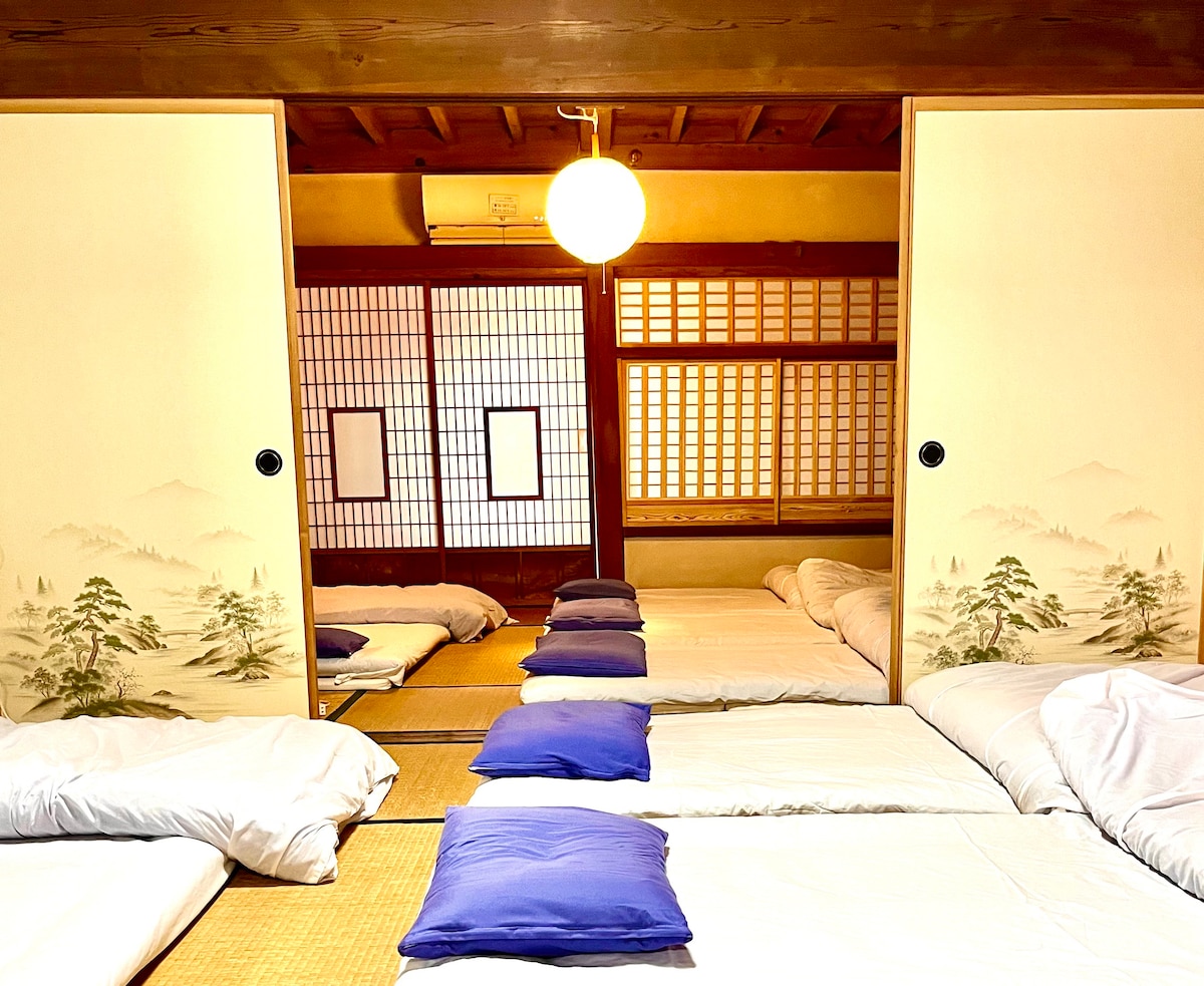 Countryside estate between a vast park and Kyoto-style gardens. This historic silkworm farmhouse was lovingly restored by its owners who created a comfortable space for relaxation & socializing ★ Private 1F, terrace and parking area. No other guests on 2F ★ Dining area and six attached tatami rooms surrounded by a wooden corridor ★ Thick futons ★ Gas BBQ on the terrace, or cook Japanese "nabe" ★ Kitchenware & appliances for heating take out ★ Walk to convenience & grocery stores ★ Nearby onsen