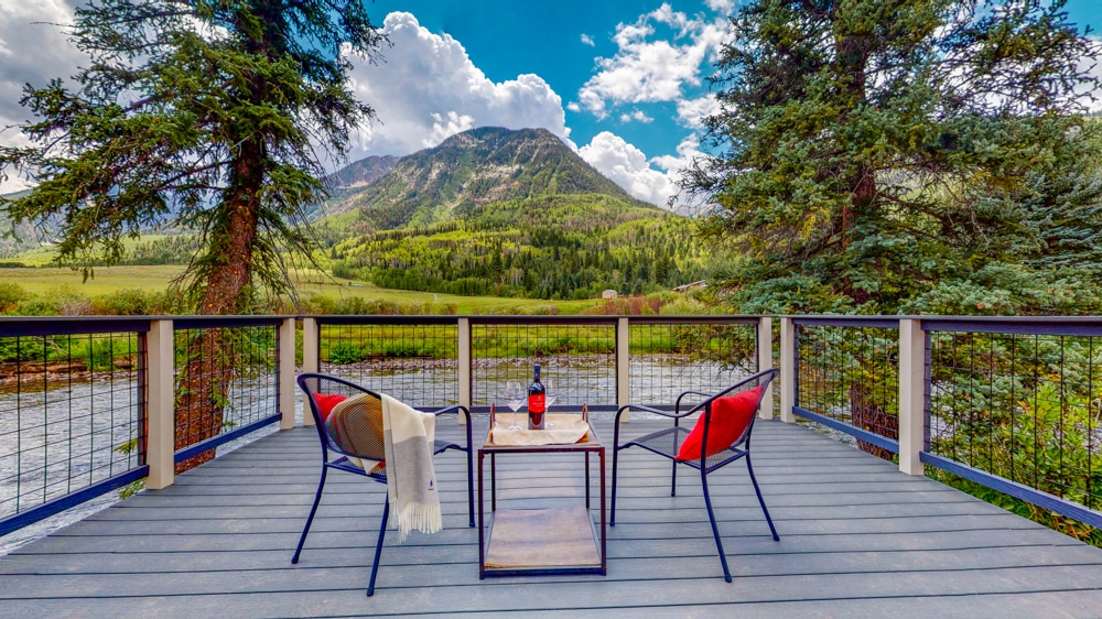 Crystal River Room: This is a Main Level corner room equipped with a queen bed and Trundle Bed (for extra price per night). It includes a full private bathroom with shower as well as direct access to the hot tub deck which overlooks a stunning view of Darien Ranch at the base of Prospect Mountain, on Crystal River.