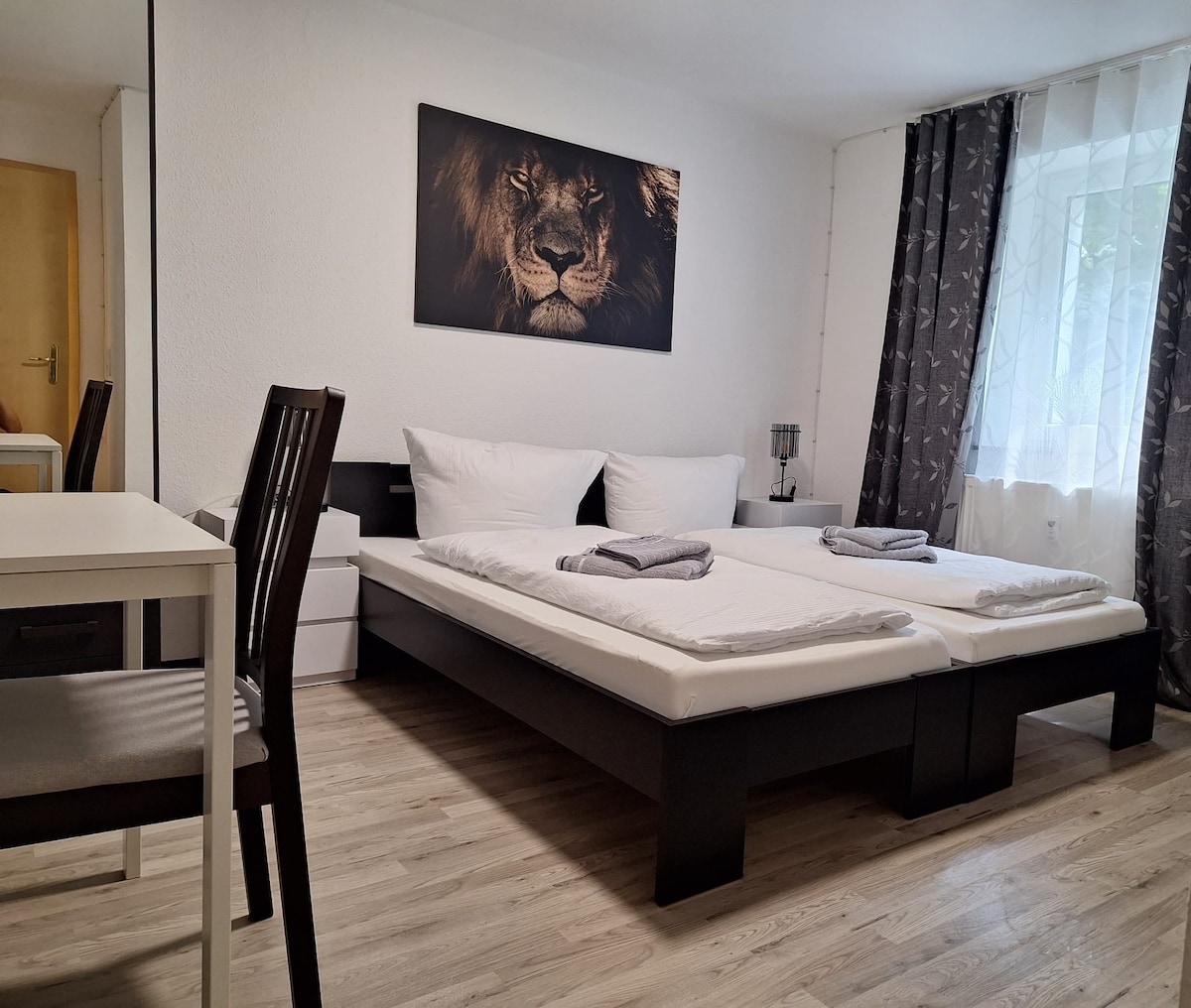 Moderne Studiowohnung mit Küche, Bad und großem Balkon in ruhiger Lage. Im Wohnzimmer befinden sich ein ausziehbares Bett mit Matratze und ein ausziehbares Sofa. Auf beiden können je 2 Personen bequem schlafen. Küche und Bad sind neu renoviert und voll ausgestattet. Ca. 500 Meter von der Wohnung befindet sich eine Straßenbahnhaltestelle. Von dort fährt man etwa 10 Minuten in die Innenstadt. Aldi, Lidl, sowie eine Tankstelle, die 24 Stunden geöffnet ist sind in ca. 5 Minuten zu Fuß erreichbar.
