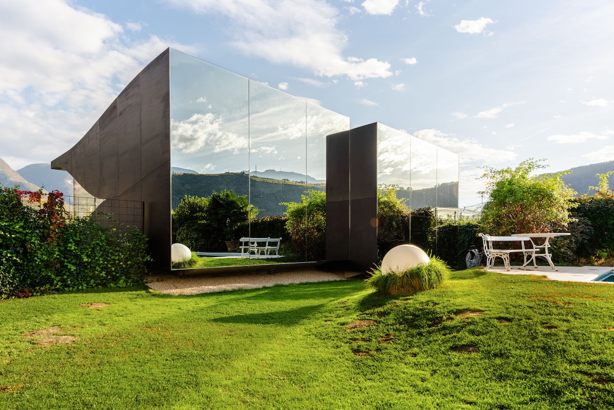 The Mirror Houses are a pair of vacation homes, set in the marvellous surroundings of the South Tyrolean Dolomites, amidst a beautiful scenery of apple orchards, just outside the city of Bolzano. The floating mirrored tiny houses designed by the architect architecture by Peter Pichler offer a unique unique opportunity to spend an unforgettable vacation surrounded by the astonishing beauty of South Tyrol's nature.