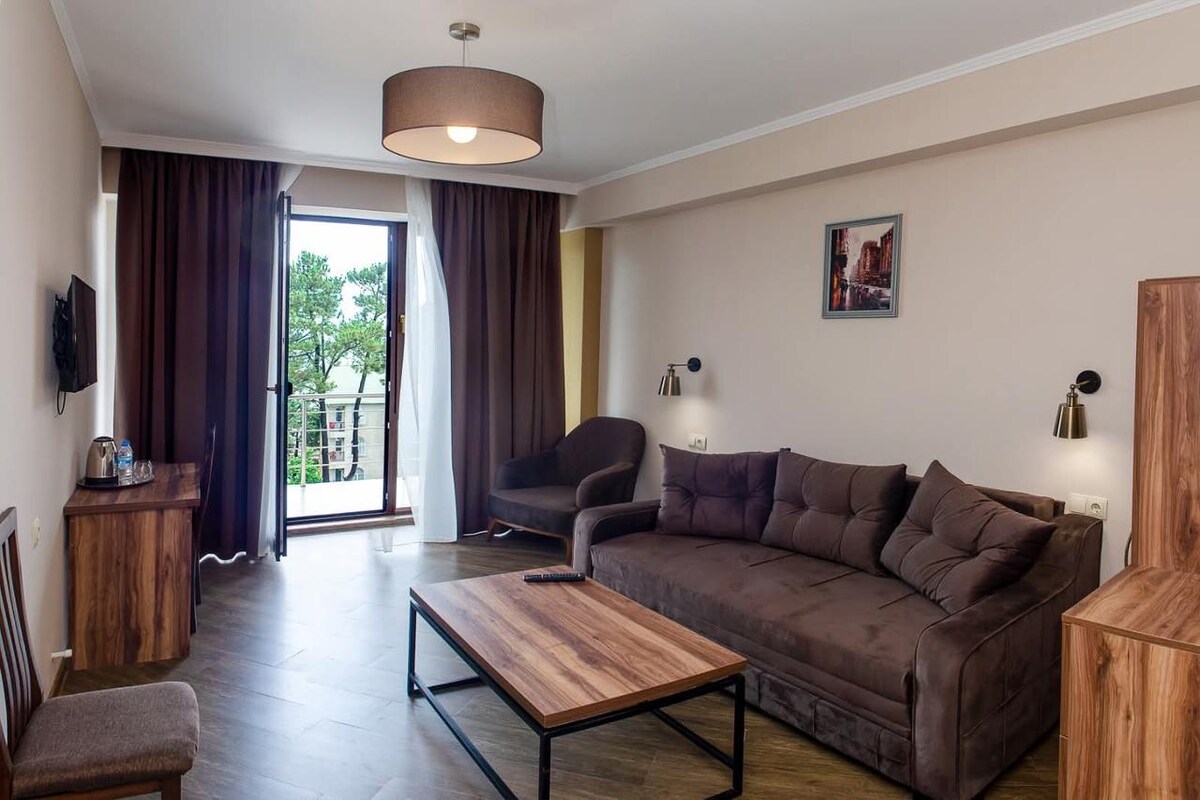 3-seater Deluxe family room with balcony in the new "Golden Lion" hotel built in 2019. Second floor. The first line, a balcony towards the street, partially visible sea, pine forest.Air conditioning, shower, toilet, TV, electric kettle, dishes, hairdryer.You can order breakfast. Breakfast can be ordered. Guests can use the shared kitchen between October and June. Outdoor swimming pool. Near the house is a large green courtyard, barbecue. Free parking. WIFI. To the sea 150 meters