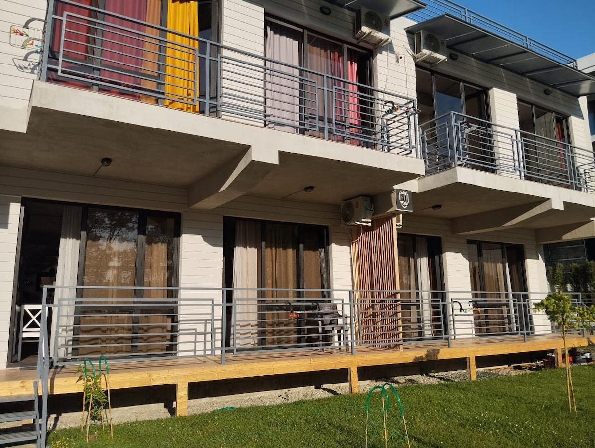Separate apartments of 54 m2 in Ureki, Guria, in a new cottage, separate entrances. Living room with kitchen and 2 bedrooms, bathroom, hallway. 350 m to the sea. Beaches - therapeutic magnetic sands. Furniture, appliances, linen, dishes - everything is new and everything is there. Hot water, gas, air conditioning, refrigerator, stove, washing machine, microwave, Wi-Fi, TV, gas heater - "karma". Own parking. Recreation area in the yard. Eucalyptus, firs and pines around the house. For all family.