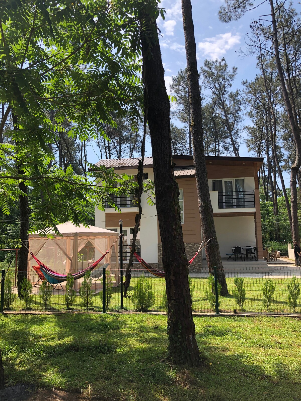 Check in and relax in this calm, stylish space, where the interior nicely blends with the trees and the sea. This place is ideally located at the intersection of the main and the secondary roads, just a perfect match of the serenity and access to the nearby shops and the central highway. There are three dendrological parks at a walking distance and a 5-star Paragraph hotel to spend a day in water park or a have an evening drink. The sea is exceptionally calm in this area and 5-7 minutes away.