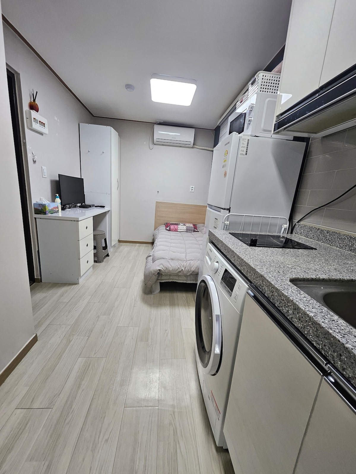 - 房间7坪,床135*200,书桌1300*600,可以保管行李 - 具备可办公、可做饭的简单餐具,智能电视 50 英寸 - Wifi, 大衣柜, 大冰箱, 洗衣机, 晾衣架, 吹风机, 毛巾, 纸巾, 水 收费停车 洗发水、沐浴露、护发素、香皂 - 从仁川机场到宿舍正门乘坐机场巴士时56分钟(包括6分钟步行) - 从宿舍可以走着去的地方 大创(6分钟),OLIVE YOUNG(3分钟),时代广场(3分钟),汗蒸房(6分钟) -从宿舍坐地铁去的地方 (附近有 1 号线永登浦站、2 号线文来站、5 号线永登浦市场站) 东大门 DDP(41 分钟),汝矣岛汉江公园(21 分钟),清溪川(41 分钟),景福宫(39 分钟) 弘益大学入口站(24分钟),北村韩屋村(41分钟),明洞(36分钟),圣水洞(47分钟) 文来洞(12分钟),永登浦站是KTX停车站,去釜山等地方很方便。 清晨感受着从窗户照进来的温暖阳光 晚上坐在房间的窗边享受时代广场的夜景