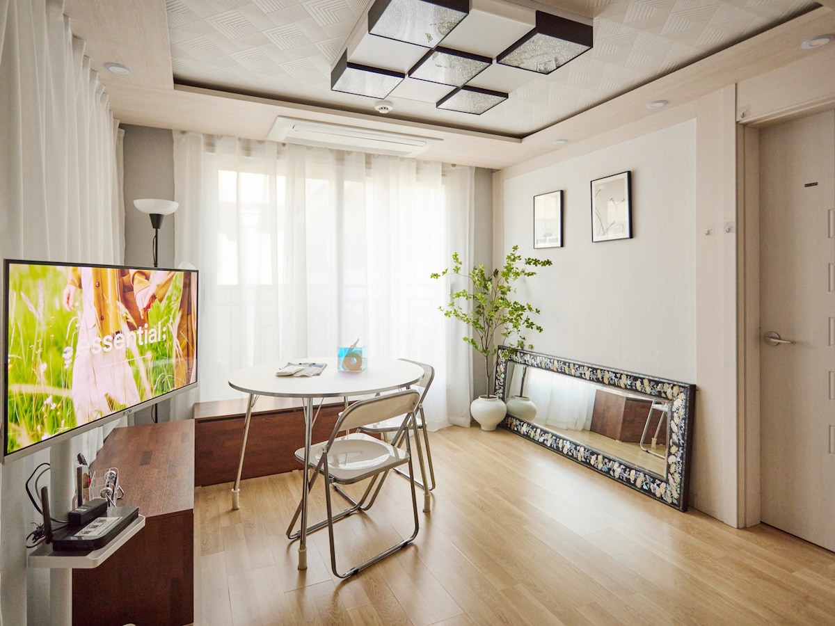 [휴스테이 Hue Stay] 🏠후기가 좋은 休휴스테이는 외국인도시민박업과 미스터멘션 실증 특례를 적용받은 내외국인 공유숙박 합법 숙소입니다. ° 방 2, 화장실 1, 주방 1, 거실 1 ° 건물내 무료주차 1대 ° 엘리베이터 ° LG 시스템 에어컨 ° 공기환기설비 ° 공기청정기 ° 60인치 삼성UHD 스마트 TV ° 닌텐도 위 ° NETFLIX [침실 1] ° 퀸침대 ° 싱글침대 ° 씨네빔(넷플릭스) ° 침구류 [침실2] ° 슈퍼싱글침대 ° 화장대/드라이기, 고데기, 빗 ° 침구류 [거실] ° LG 에어컨[천장형] ° 쇼파침대(70X240) ° 4인식탁 ° 60인치 TV/넷플릭스 ° 닌텐도 위 ° 다리 맛사지기 ° 블루투스스피커 ° 미니듀얼 블루투스 노래방 마이크 ° 무선다리미 ° 구급함 ° 보드게임 [주방] ° 냉장,냉동고 ° 전자레인지 ° 밥솥 ° 5인 식기세트 ° 조미료 ° 냄비, 프라이팬, 조리도구 [욕실] ° 비데 ° 수건 ° 샴푸,린스,바디워시,클렌징폼