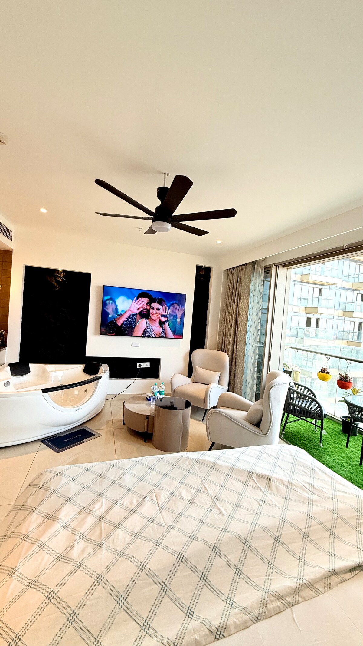 Insta - airbnb_gogo.homes Gogo Homes Kimika is the perfect retreat to recharge and relax. Enjoy a stay featuring a soothing nozzled live Jacuzzi, ideal for unwinding. After your soak, take in the stunning views of Gurgaon’s skyscrapers from our terrace garden, with delicious bites from nearby award winning restaurants Located in the upscale Sector 27 of Gurugram! Price mentioned is for 2pax. Although space is good enough to invite people for gatherings! Extra guests will be chargeableable