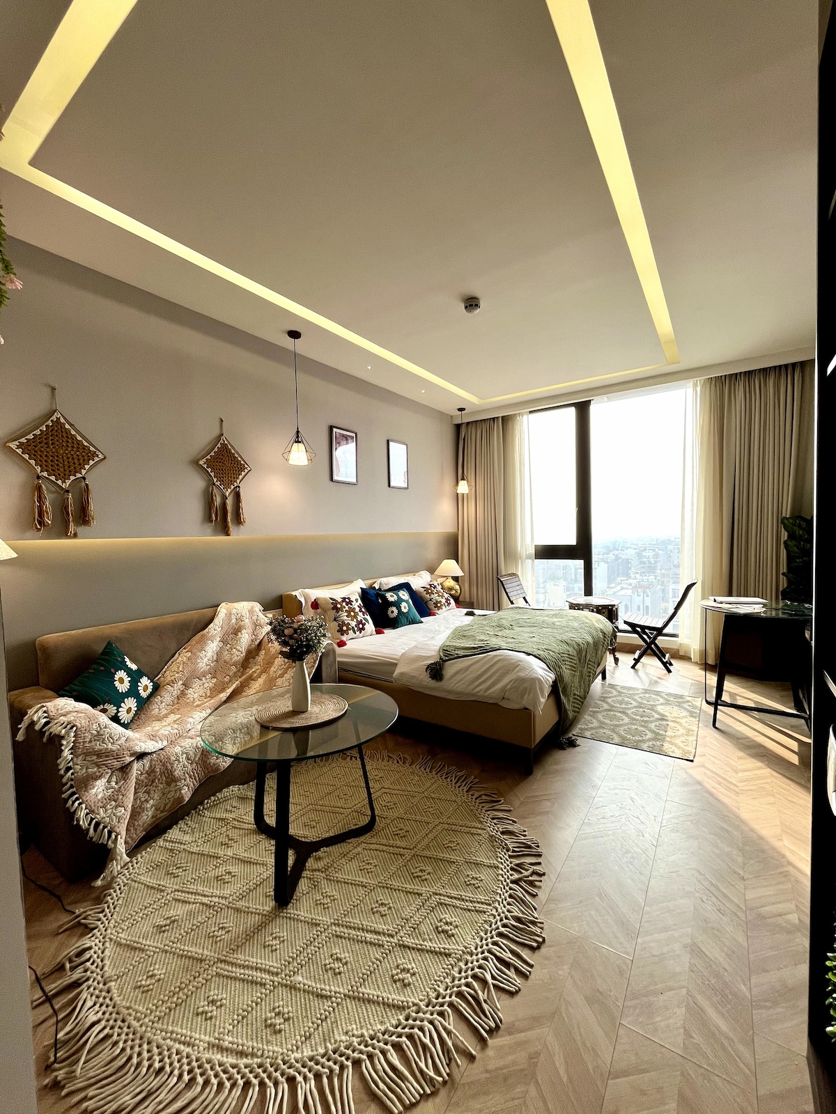 Aurae by Lumen Leaf is a designer luxury studio soaring high above AIPL Joy Street, Gurgaon. Floor-to-ceiling glass frames city views. Enjoy unmatched comfort: designer bed, soft throws, mood lighting, fast Wi-Fi, Netflix, retro game console, Marshall speaker, dedicated workspace, kitchenette, minibar and a sun-lit reading nook. INOX, cafes and shops sit downstairs, while CyberHub, Golf Course Road and HUDA City Metro are 12 min away - ideal for business trips, staycations or couple escapes.