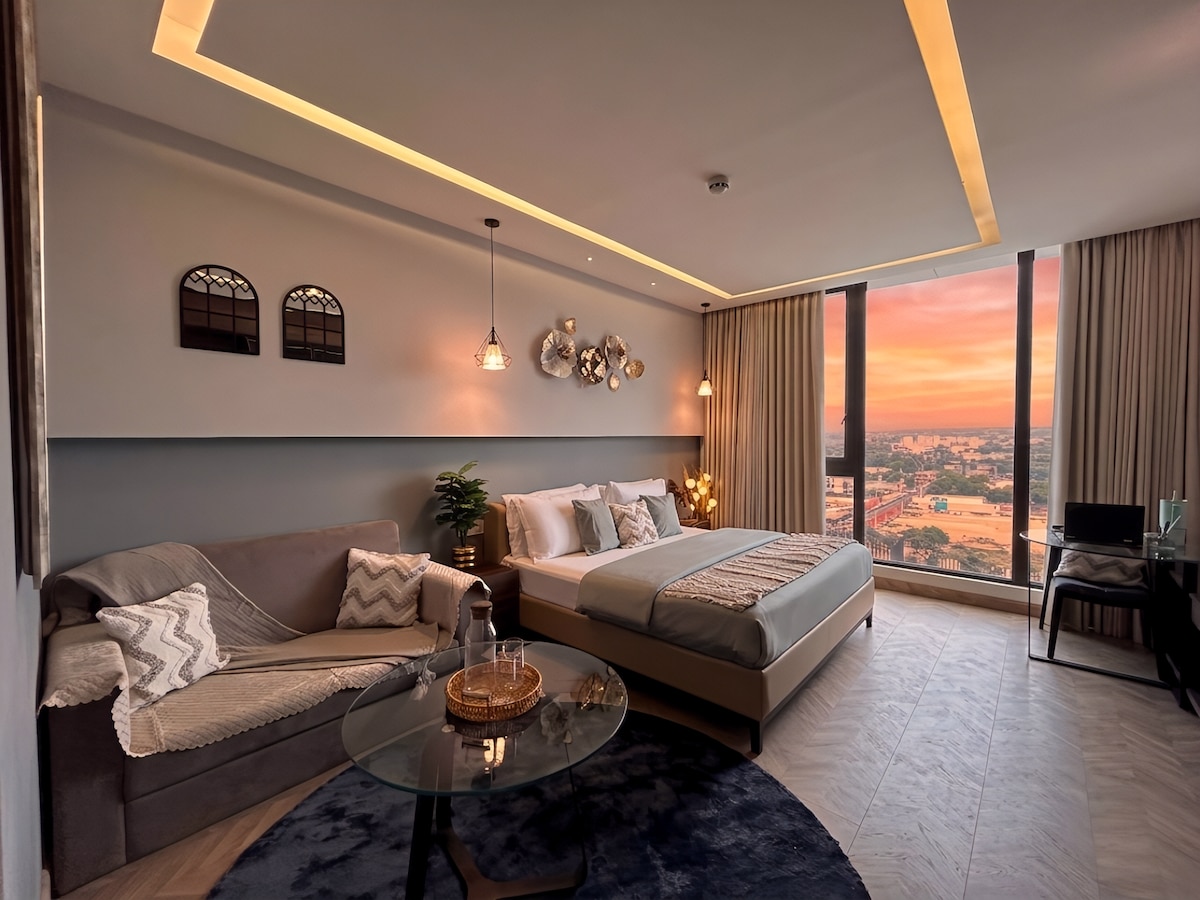 Luxe Heaven Heights 12th Patio 2 stands out with its private 2-seater jacuzzi, stunning high-rise city views, and modern architecture. The big wall mirror adds elegance, while the spa-like bathroom ensures luxury. Guests enjoy a pool, gym, high-speed WiFi, big-screen TV, and 24x7 security & parking. The fully equipped kitchen makes home-cooked meals easy. Located in Gurgaon’s prime area, it’s super safe for women and offers exclusive private access!